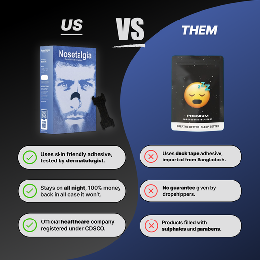 Nosetalgia are groundbreaking sleep strips that support nose breathing, leading to enhanced sleep quality, decreased snoring, and numerous health benefits. By gently keeping your mouth closed during sleep, Nosetalgia helps you embrace your body's natural breathing mechanism, allowing you to experience all the benefits of nose breathing without the typical side effects of other snoring solutions.